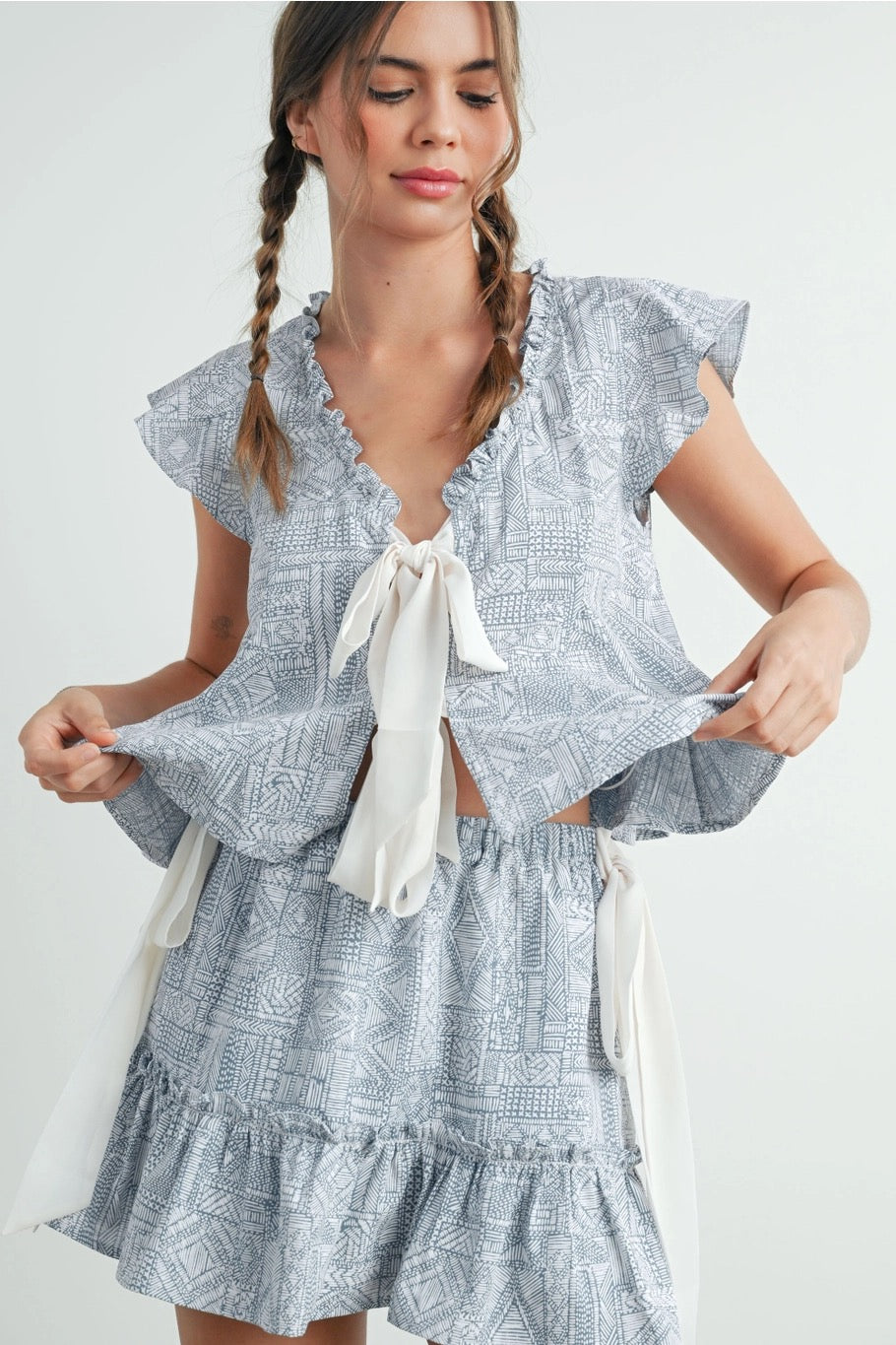 This lightweight boho-inspired top & skirt features a chic geometric print and tiered ruffle details for a playful, feminine vibe. Accentuated with elegant front & side ties, it offers an adjustable fit that adds charm and versatility. Perfect for sunny days or casual outings.