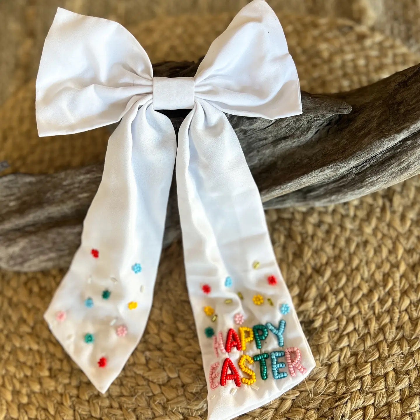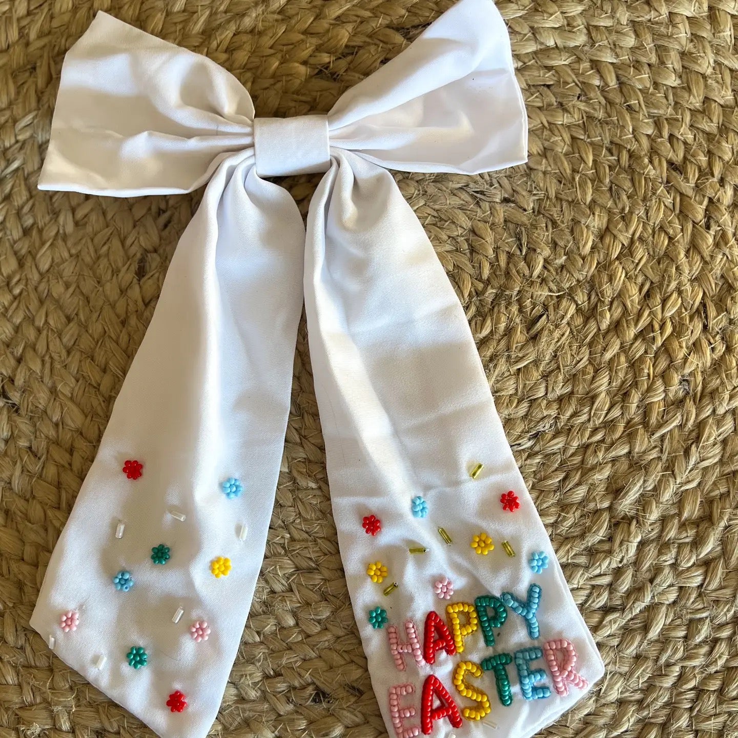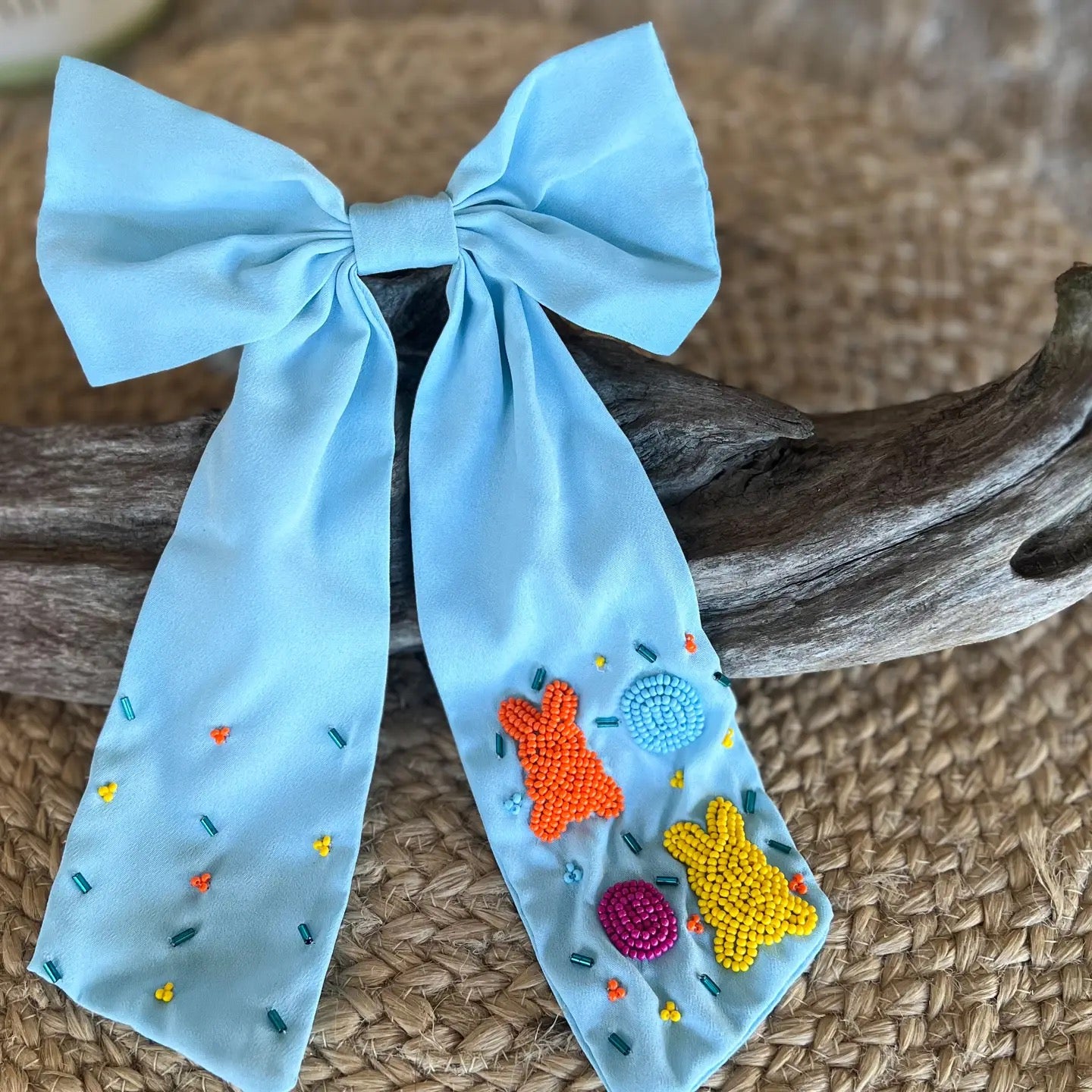Beaded Hair Bow, featuring intricate hand-embroidered beadwork. Measuring 8.5 inches wide with a 9-inch tail, this bow makes a bold, festive statement—perfect for parades, parties, or adding a touch of luck to your outfit!