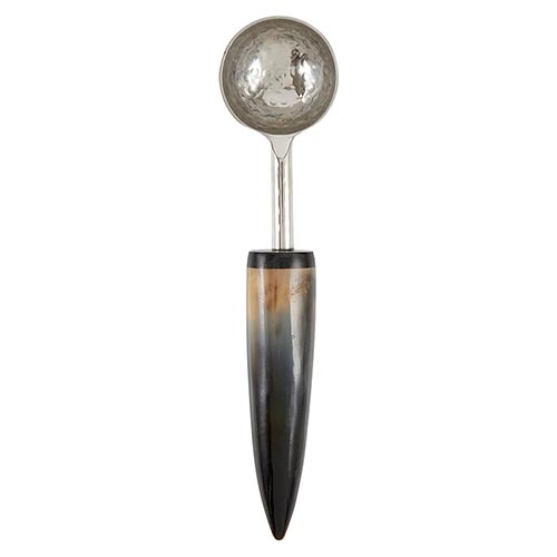 This horn scooper is hand-crafted from the horns of Indian buffalo. Skilled artisans use the horns to create beautiful and functional objects such as this unique, one-of-a-kind table accessory. May vary slightly in color and shape.