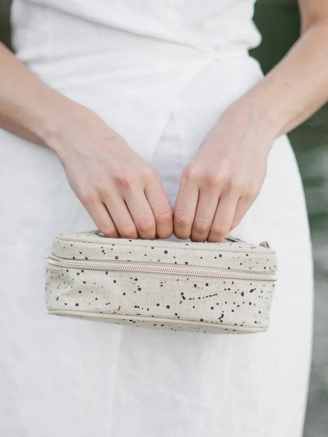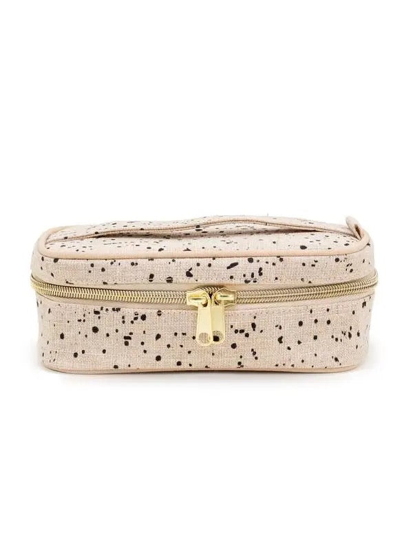 Wherever life takes you, the Petite Essentials Pouch makes self-care easy. This compact, zippered pouch is perfectly-sized to store your essentials from makeup products to pencil case must-haves. Finished with elegant gold hardware, an interior mesh pocket, and an easy-to-carry handle, you’ll soon be wondering how you ever left home without this fundamental addition to on-the-go beauty. Our timeless Linen Splatter Petite Essentials Poche will help you stay organized in style, featuring a sophisticated, minimal design and a goes-with-anything neutral palette. This print is our best-seller for a reason and now it’s ready to help keep all your everyday essentials close at hand.