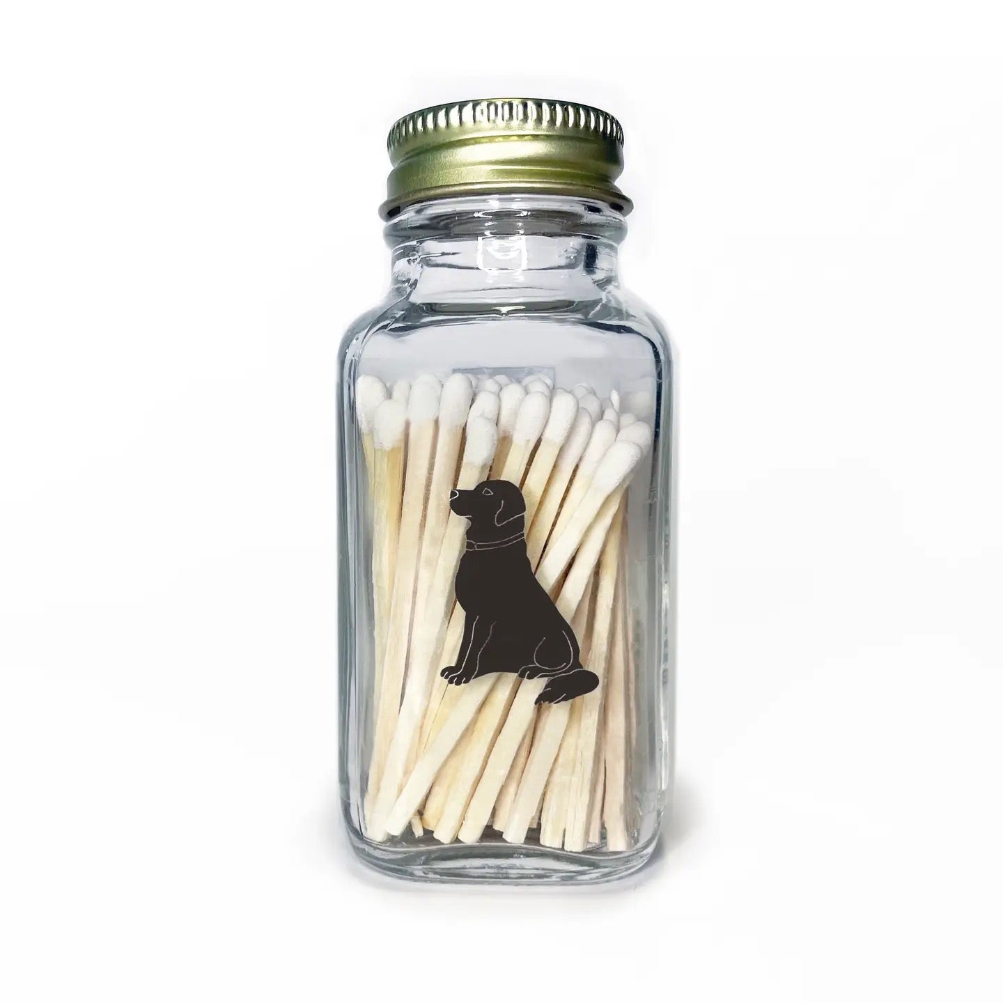 Light a trusty spark with this jar full of classic white matches, adorned with a simple illustration of a sweet lab dog! This square glass bottle contains about (80) 2" safety matches with classic white tips, perfect for lighting candles.