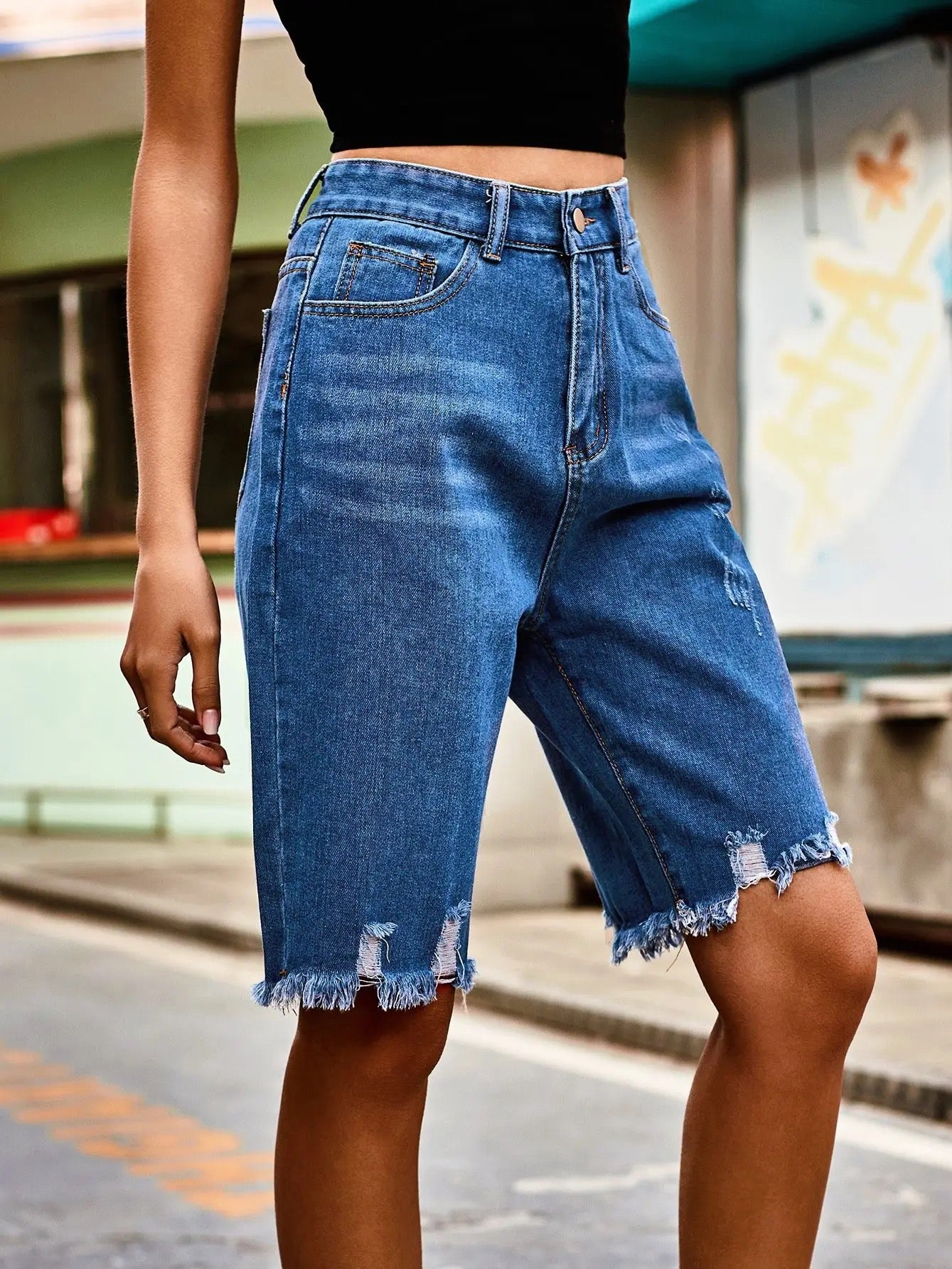 Stylish Ripped Raw Denim Cropped Shorts, Dark Wash
