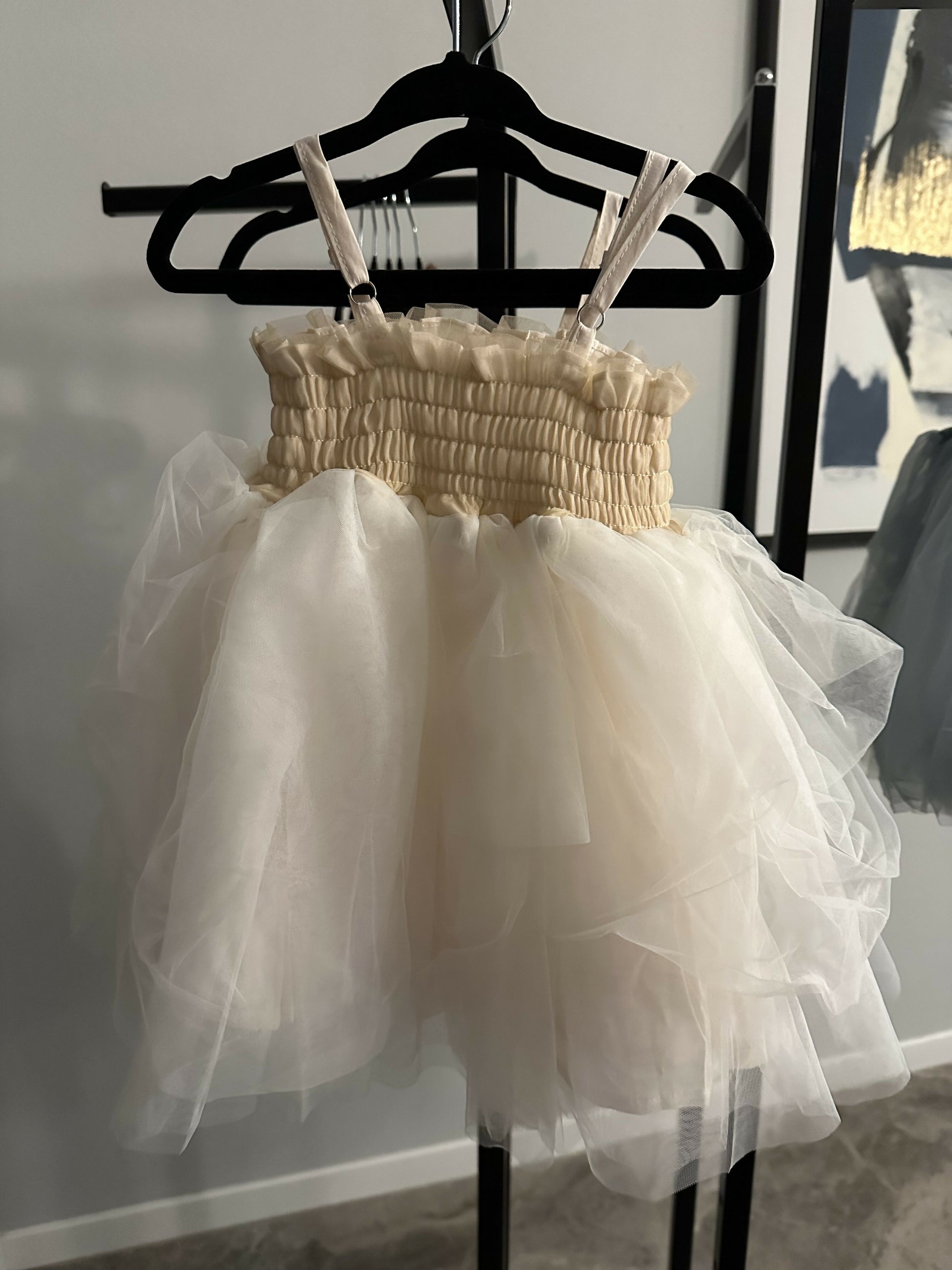 The thin straps add a delicate and feminine touch to the overall design, while the layered pink tulle skirt creates a stunning ballerina-inspired look that your little one is sure to love. The tulle layers provide volume and movement to the dress, making it perfect for twirling and dancing around.
